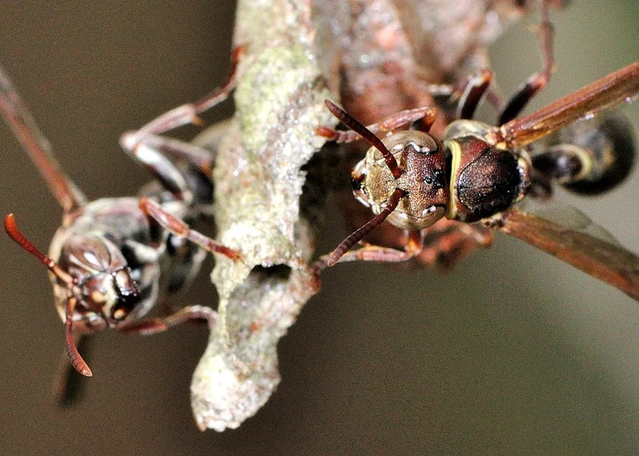 Nest Material: Papery nests constructed in trees, under roofs, or other sheltered areas.